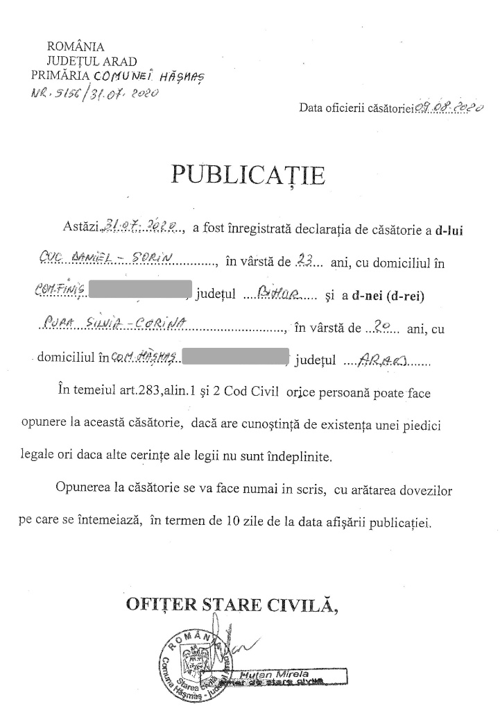 Publicație de căsătorie – Cuc Daniel-Sorin / Pura Silvia-Corina
