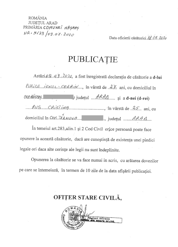 Publicație de căsătorie – Purice Ionel-Codrin / Rus Cristina